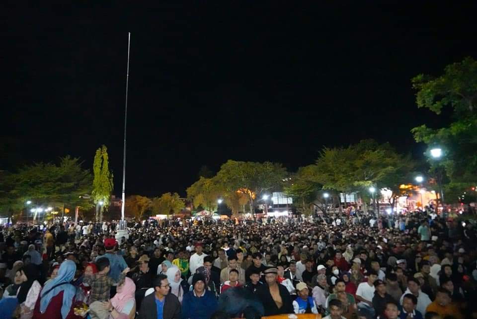 Ribuan masyarakat Tanah Datar tumpah ruah memadati Lapangan Cindua Mato (LCM) Batusangkar guna nonton bareng mendukung timnas U23 (Garuda Muda), Minggu (29/4/2024) malam.