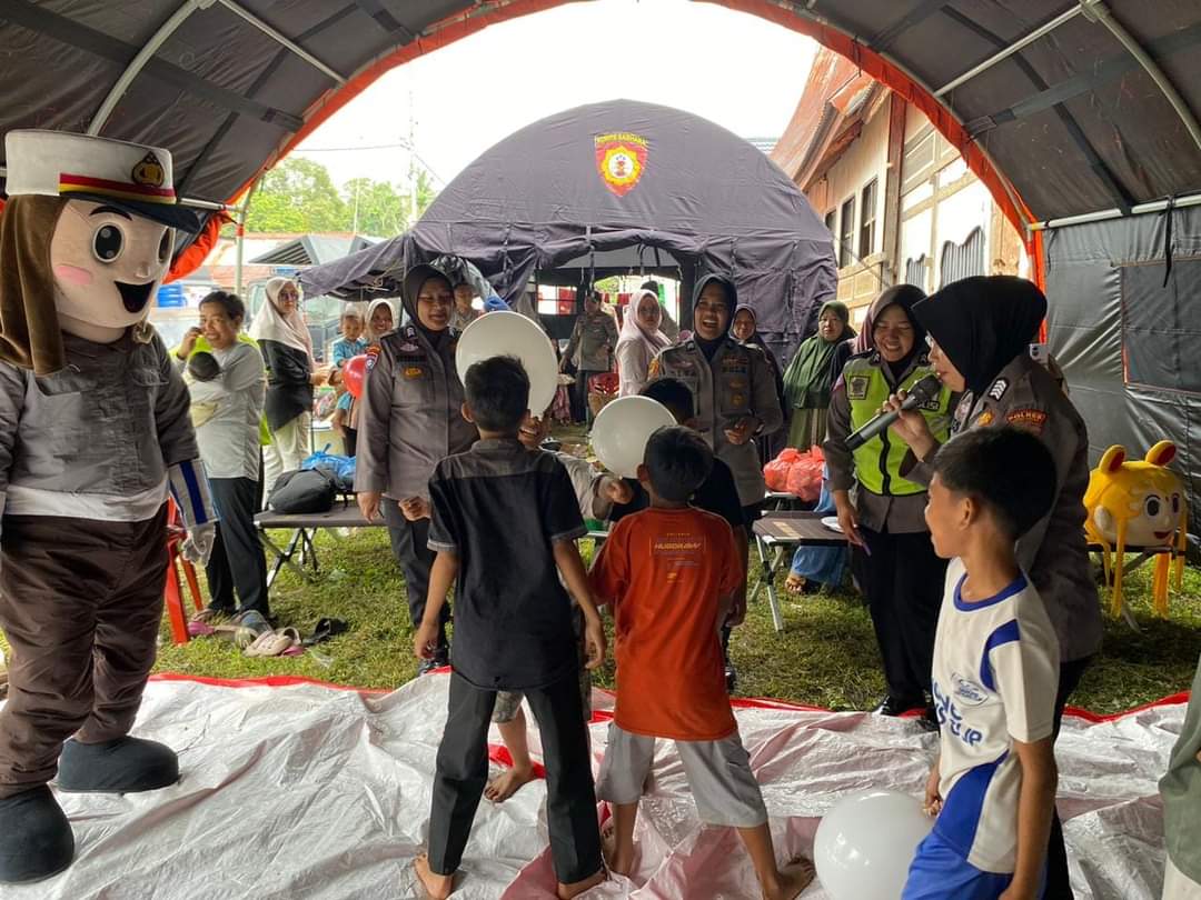 Sementara itu, Kapolres AKBP Derry Indra menjelaskan bahwa Tim Trauma Healing Polri menjalankan tugas perbantuan bencana alam, khususnya dalam penanganan pemulihan dampak psikologis traumatik dan memberikan semangat positif.